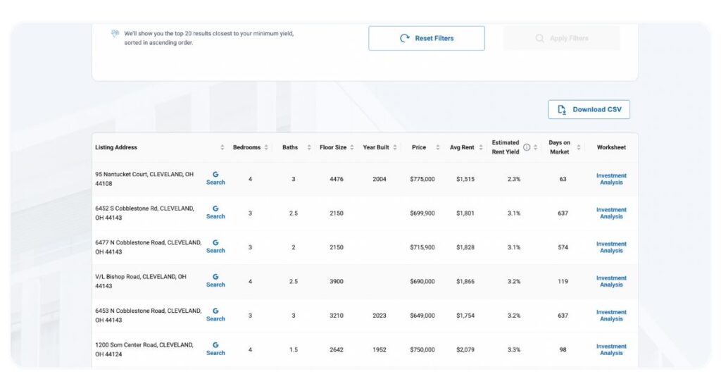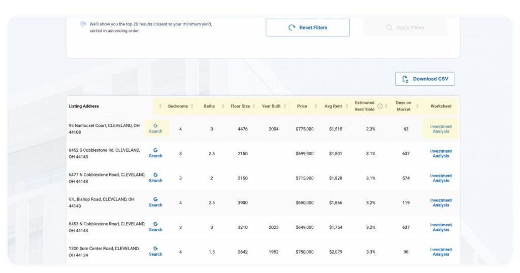 Each search shows up to 20 listings—those with yields closest to your minimum threshold.